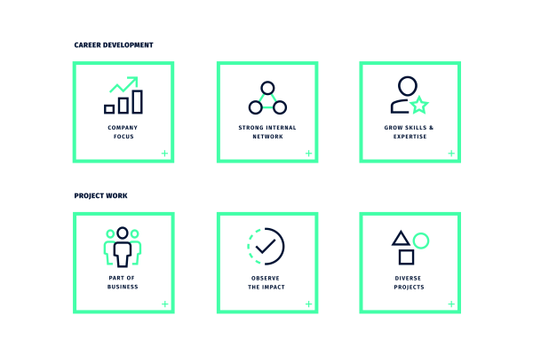 Das frische, tiefblaue User Interface – inspiriert von klassischen Business-Outfits – vermittelt Professionalität und schafft zugleich eine einladende Atmosphäre. Es soll Neugier wecken, die Beschäftigung mit dem Karriereweg im Inhouse Consulting fördern und potenzielle Bewerber:innen motivieren, aktiv den nächsten Schritt zu gehen.